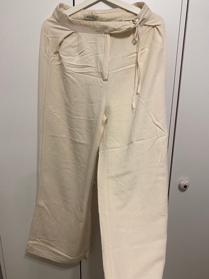 Bej keten midi pantolon, bol kesimiyle rahat bir kullanım sunar. Minimalist ve normcore tarzda, gündelik kullanıma uygun hafif ve desensiz model. Belden bağlama detaylı keten palazzo açık bej butik ürünü
