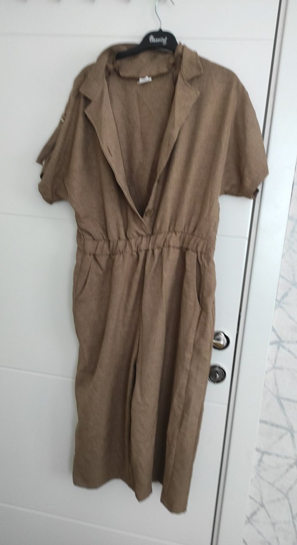 Bej keten midi kadın tulum, kısa kollu ve kesik yakalıdır. Düğmeli ön kısmı ve elastik bel ile rahat, minimalist tarzda.midi boy115,iki koltuk arası 58