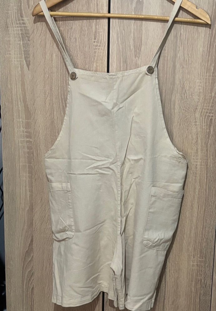 Bol kesim, keten kumaştan bej midi kısa salopet, halter yaka ve kolsuz tasarıma sahip, büyük ön ceplerle sade bir görünüm sunar. İade kabul etmiyorum.Sorup alınız lütfen
