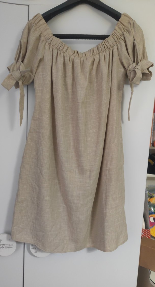 Bej keten kumaştan yapılmış, kayık yaka ve fiyonk bağcık detaylı askılı kollara sahip, bol kesim midi boy elbisedir. Minimalist ve bohem tarzda rahat bir seçimdir. Bir kere giyildi herhangi bir sorunu yok.