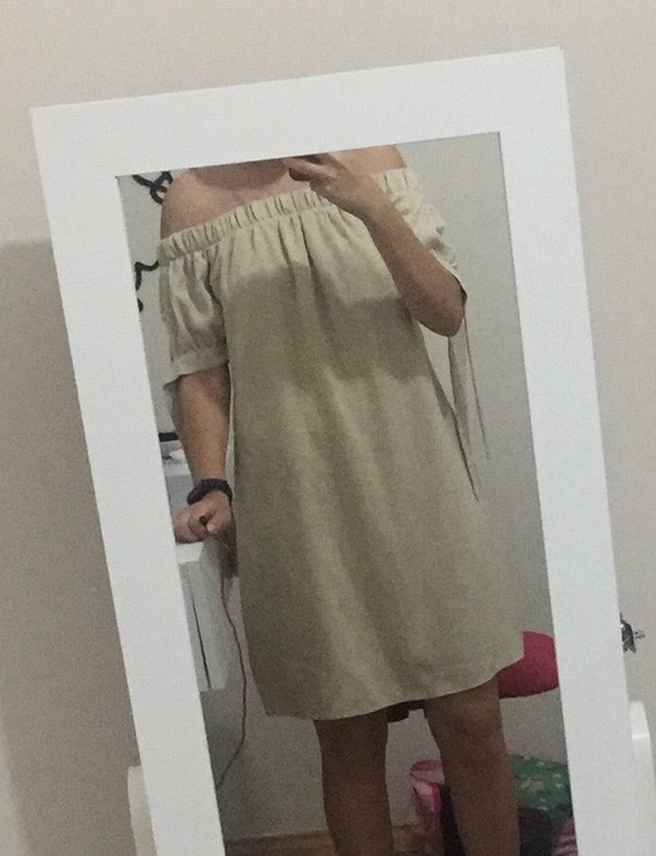 Bej renkli keten midi elbise, straplez yaka ve kısa kolludur. Gevşek kesimiyle minimalist bohem tarzında, günlük kullanıma uygundur. Astarlıdır.
