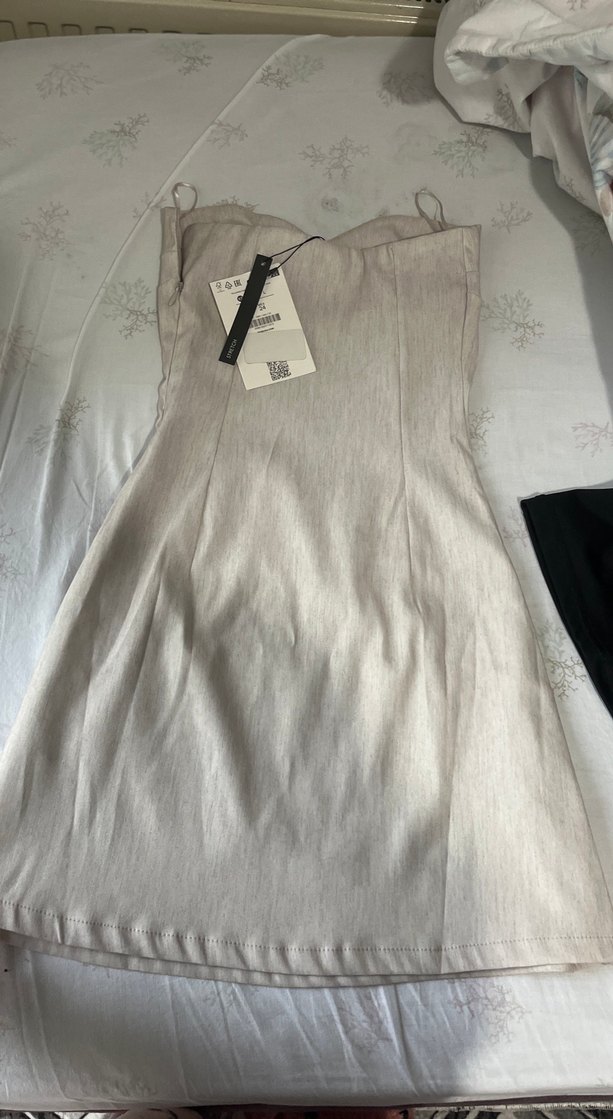 Bej keten kumaştan, straplez ve kolsuz, vücuda oturan midi elbisedir. Günlük kullanım için rahat ve şık bir tercihtir.