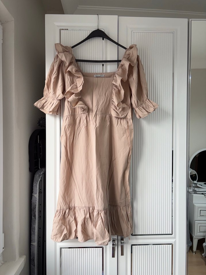 Bej keten midi elbise, straplez yakalı ve kol ile etek uçlarında volan detaylıdır. Bol kesimi ve bohem tarzıyla günlük kullanıma uygundur. Xl beden de giyebilir