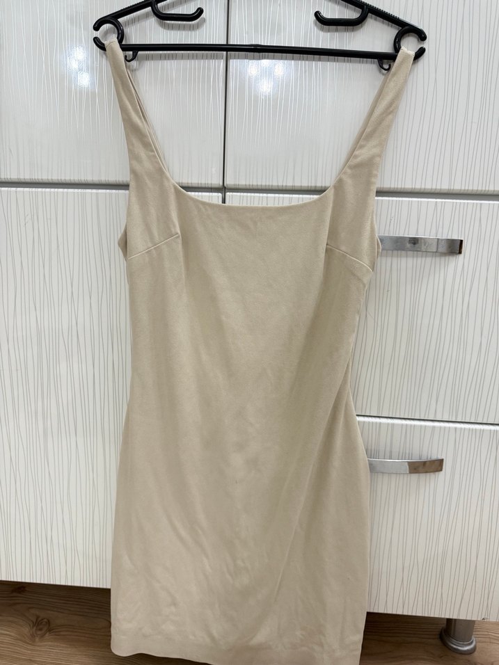 Bej renkli keten kumaştan, straplez ve vücuda oturan kesime sahip mini uzunlukta elbise. Minimalist günlük şıklık için ideal.
