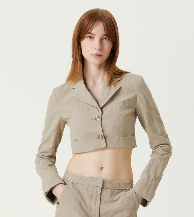 Bej keten kumaştan yapılmış, kısa uzunlukta, düğmeli ve kesimli yakalı mini blazer. Uzun kollu ve rahat kesimlidir, ofis için uygundur.