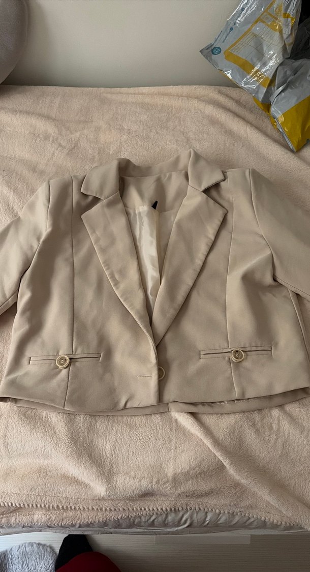 Bej keten kumaştan mini uzun kollu, düğmeli, klasik yaka blazer ceket. Ofis için rahat ve şık bir normcore tarz.