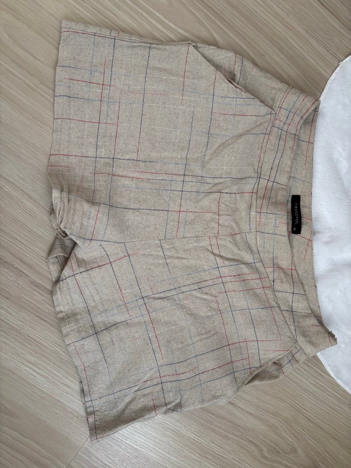 Trendyolmilla bej keten kumaştan, düğmeli ve regular fit mini kadın şort. Günlük sokak stili için uygun, hafif desenli kumaş. 38 beden.
