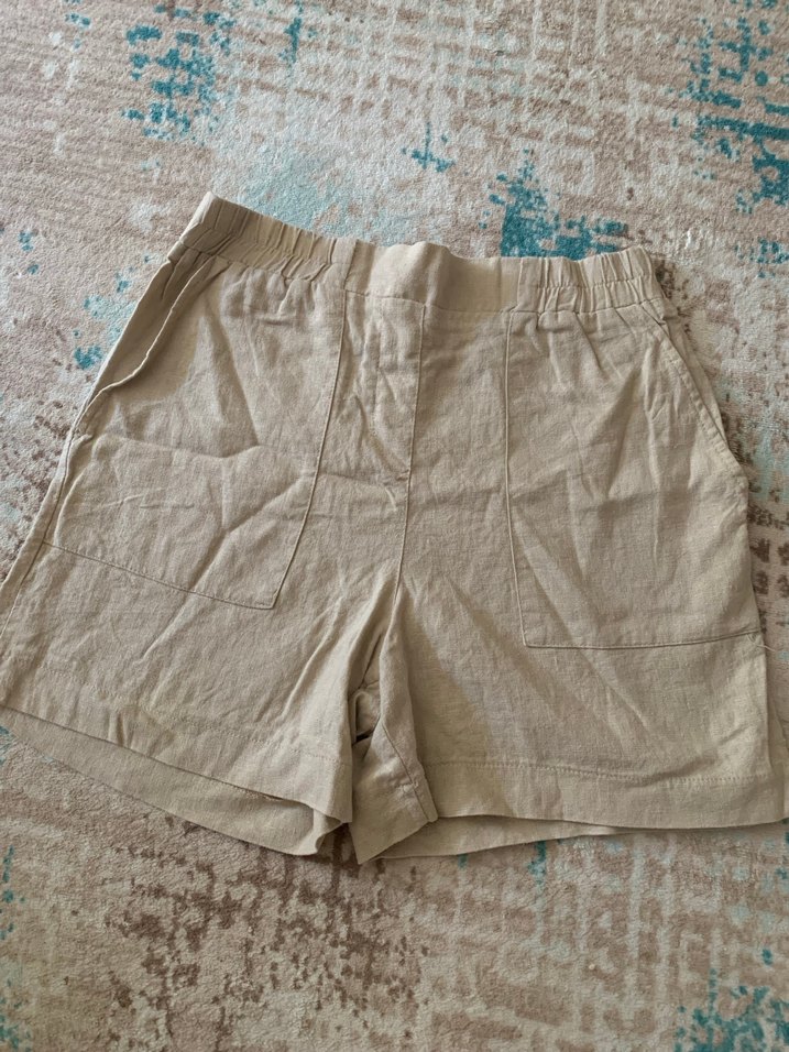 Bej keten mini şort, bol kesim ve lastikli bel ile rahat ve bohem tarz sunar. Günlük kullanıma uygundur.