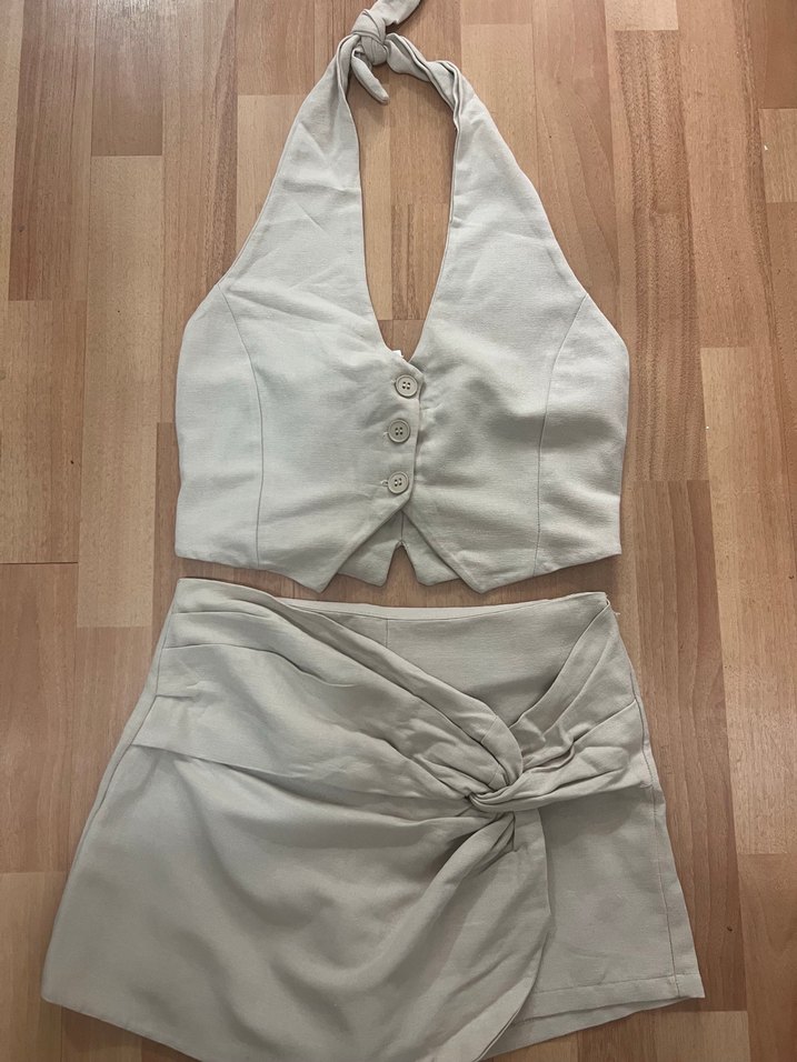 Bej keten kumaştan, düğmeli, V yaka, kolsuz üst ve düğüm detaylı mini etekten oluşan kadın takımı. Minimalist ve bohem tarzda, günlük kullanıma uygun.Hiç giyilmedi defosu yok s beden