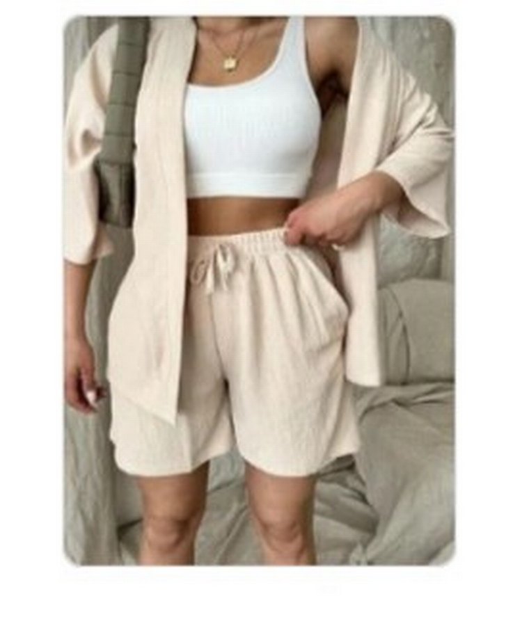 Bej keten kumaştan, bol kesim kadın takımı. Desensiz ve rahat, gündelik sokak stili için uygun. biraz iç belli ediyor ama aynı tonda iç çamaşırı giyince sorun olmuyor tatil için almıştım 2-3 kez giydim