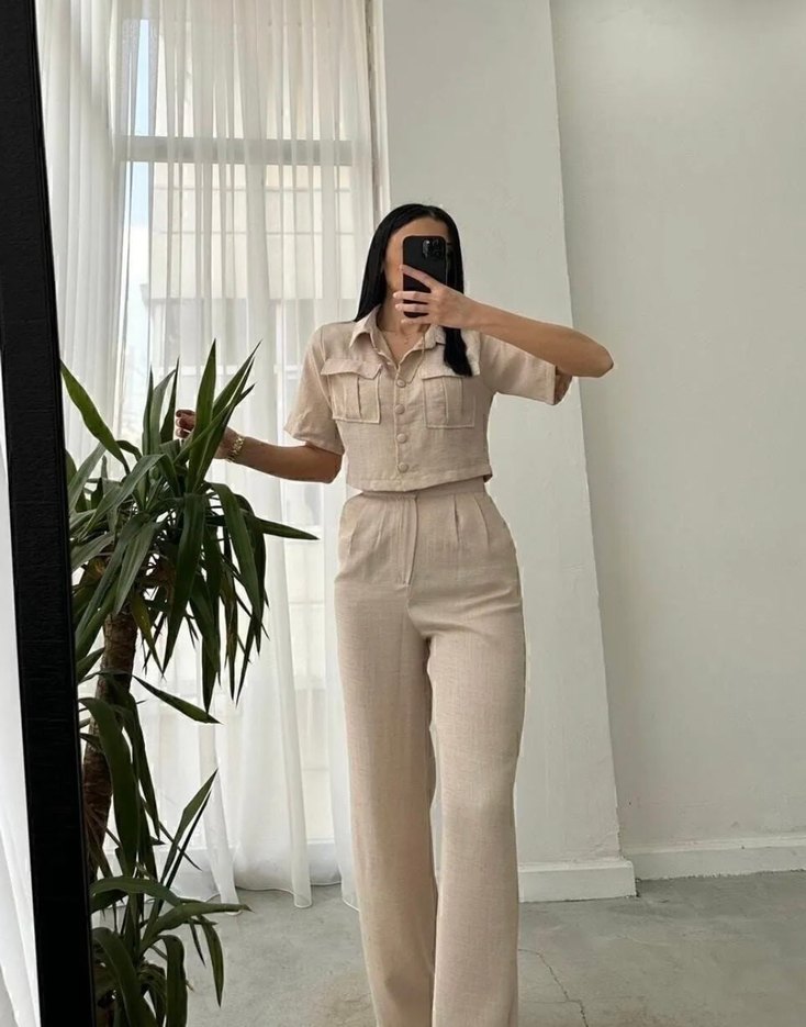 Bej renkli keten kumaştan, kısa kollu ve mini uzunlukta, sade çizgilere sahip kadın takımı. Ofis için uygun, rahat kesimli ve şık görünümlü.