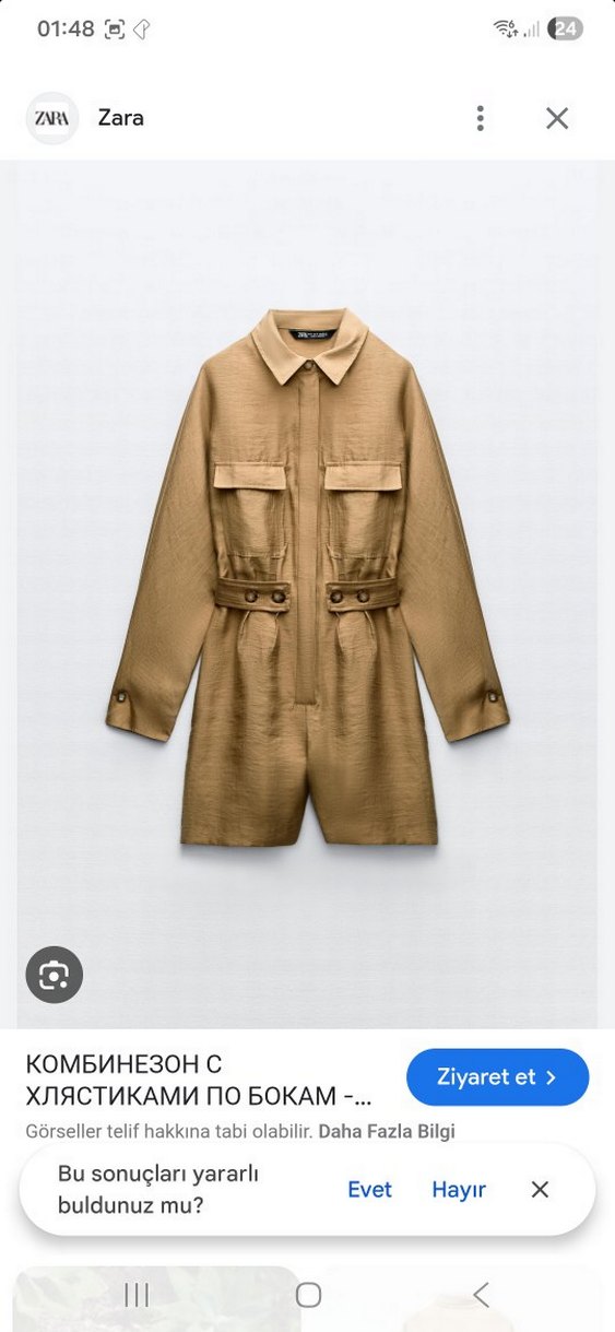 Bej keten mini tulum, uzun kollu ve yakalıdır. Bel ve manşetlerde düğme detayları bulunur. Parlak görünümlü ve regular fit, sokak modasına uygundur.