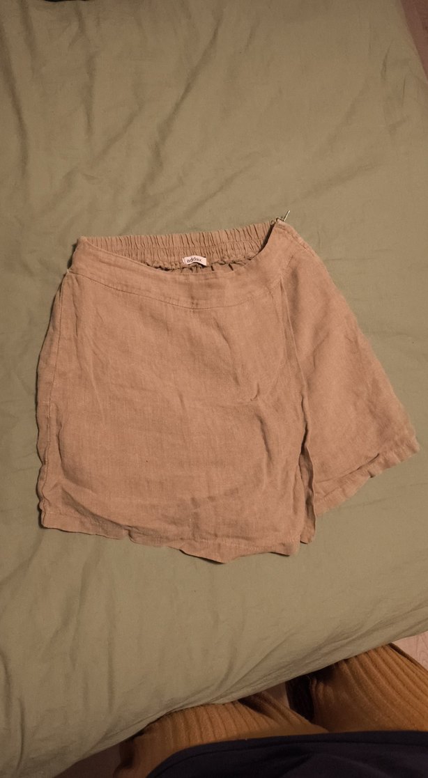 Nefes alabilen keten kumaştan yapılmış, bol kesim ve mini boyda bej şort etek. Günlük kullanım için rahat ve şık. İhtiyaç fazlası.