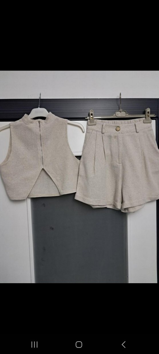 Bej keten kumaştan, önü fermuarlı straplez üst ve düğmeli yüksek bel şorttan oluşan minimalist tasarımda, günlük kullanıma uygun rahat bir takım. nadir giyildi