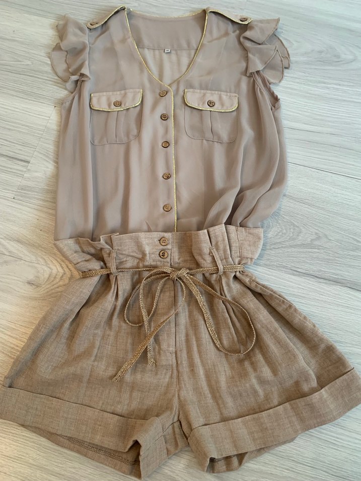 Bej keten mini tulum, düğmeli , V yakalı, volanlı kol detayı, gold biye , bağcıklı , günlük ve gece kullanım için uygun. Yurt dışı butik ürünü.36-38 beden için uygum