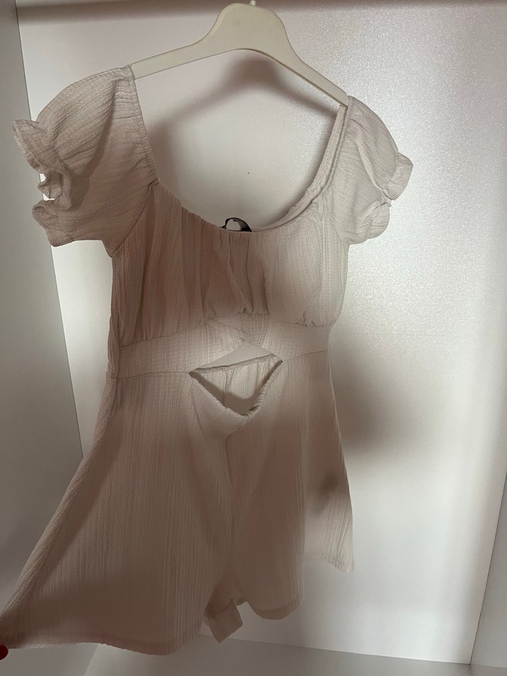 Bej keten mini tulum, askılı ve drapeli detaylara sahip, günlük kullanıma uygun, vücuda oturan kesim.