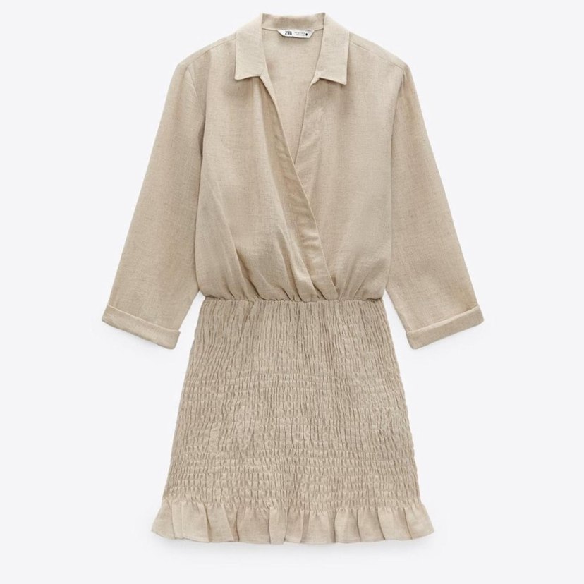 Bej keten mini elbise, uzun kollu ve gömlek yaka. Beli büzgülü, etek ucu fırfırlı, salaş ve drapeli tasarım minimal ve modern tarz sağlar. bir kez giydim orijinal zara. xs-s uyumlu