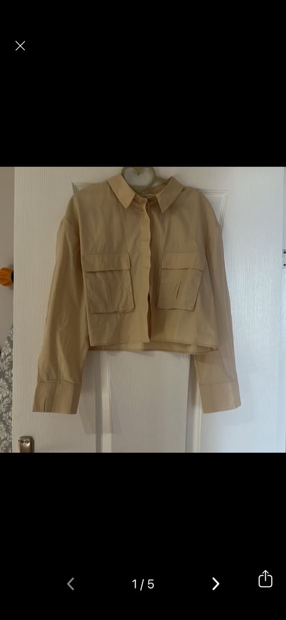 Bej renkli keten gömlek, bol kesim ve uzun kolludur. Düğmeli, kısa boylu ve kesik yakasıyla günlük sokak stiline uygundur.