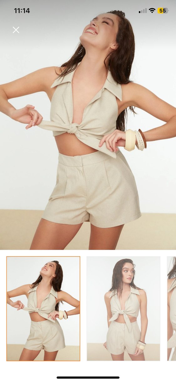 Bej renkli, keten kumaştan yapılmış takım V yaka ve kolsuz tasarımı ile rahat ve şık bir görünüm sunar. Parti için uygundur. Etiketli