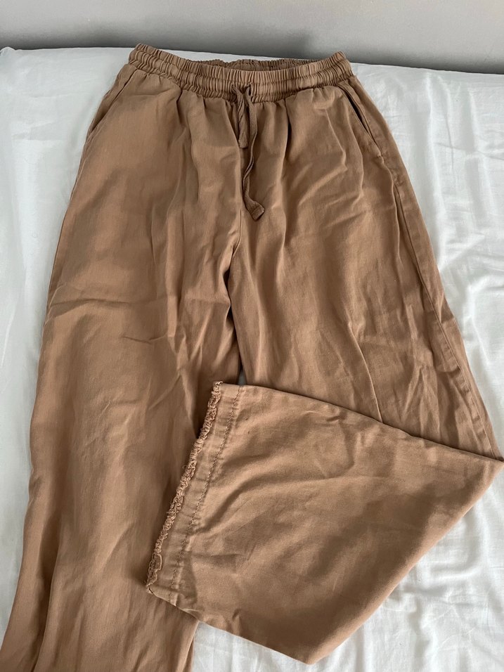 Bej keten kumaştan, rahat kesim ve midi boyda, lastikli bel detaylı parlak görünümlü kadın pantolon. Günlük kullanıma uygun şık ve rahat. Bir iki kere giyildi