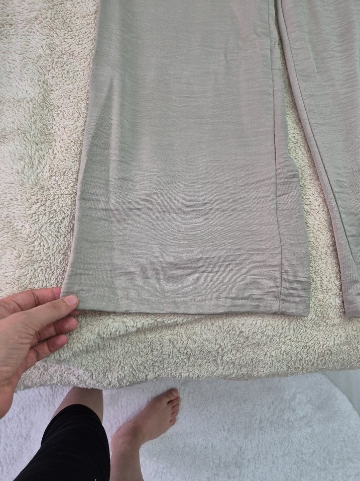 Bej keten kumaştan, yırtmaçlı ve midi boyda, vücuda oturan pantolonu, günlük kullanım için rahat ve sade bir seçenektir.