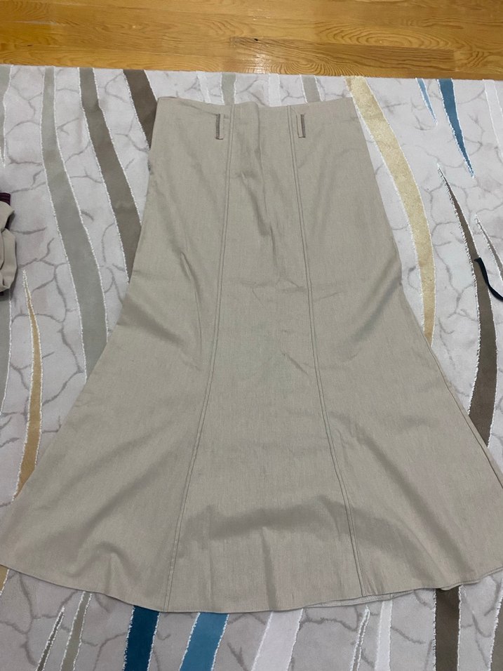 Bej keten kumaştan, pilili uzun etek. Regular fit kesimiyle ofis kullanımı için uygun, minimalist ve bohem tarzda.