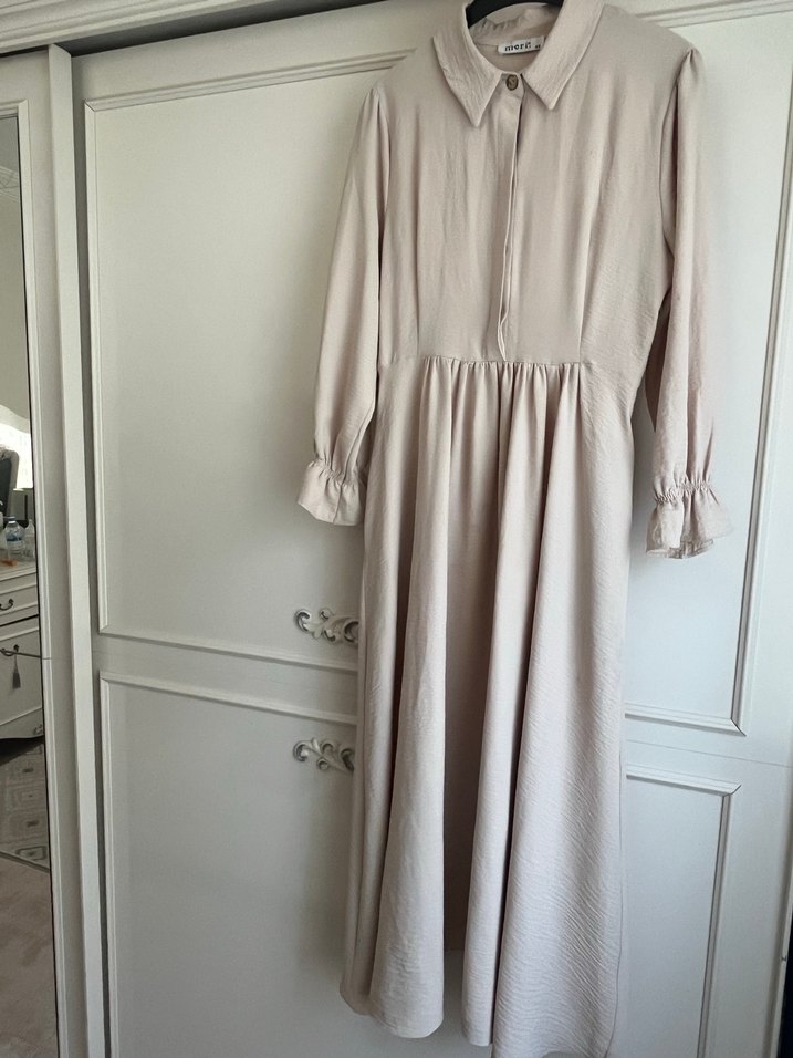 Bej keten kumaştan, uzun kollu, pilili etekli, klasik ve rahat kesim uzun elbisedir. Ofis için uygundur.