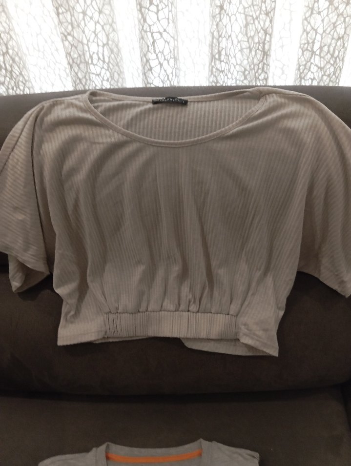 Bej renkli keten kumaştan, tek renk, kısa boylu, bol kesim ve kısa kollu kadın bluz. Pliseli detaylara sahiptir, rahat ve şık bir tercih.