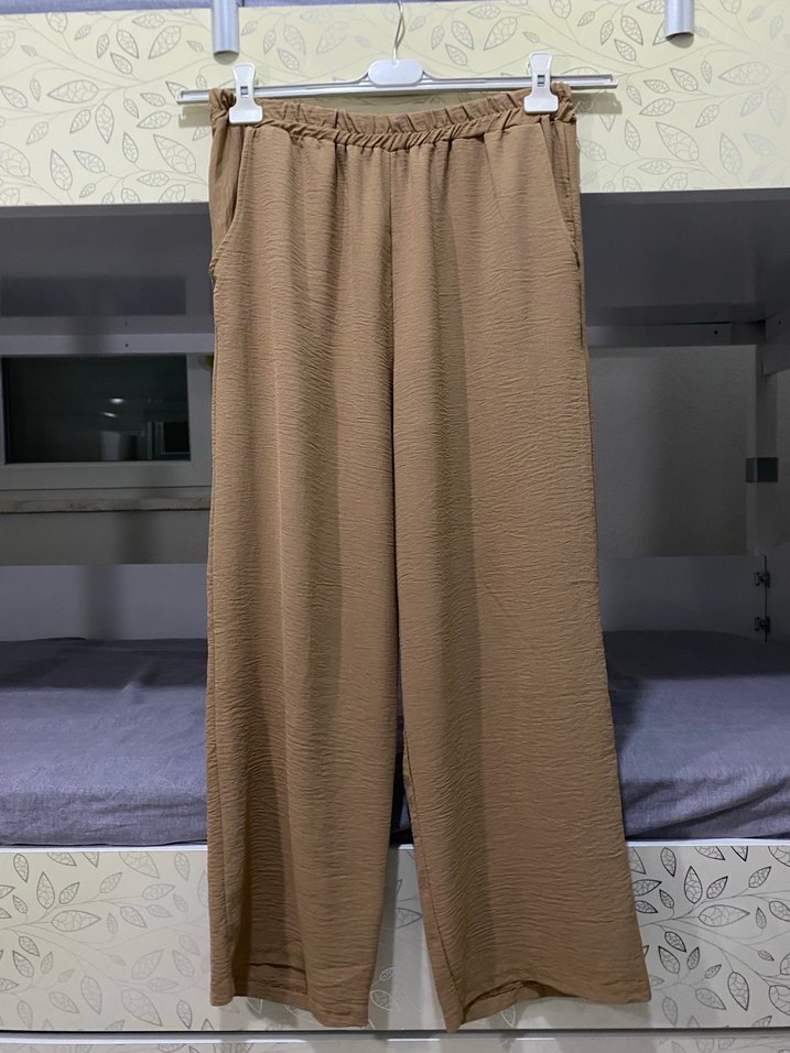 Bej keten kumaştan, bol kesim standart uzunlukta, rahat ve gündelik kullanıma uygun kadın pantolonu. Elastik bel ve cepleri ile konforlu
