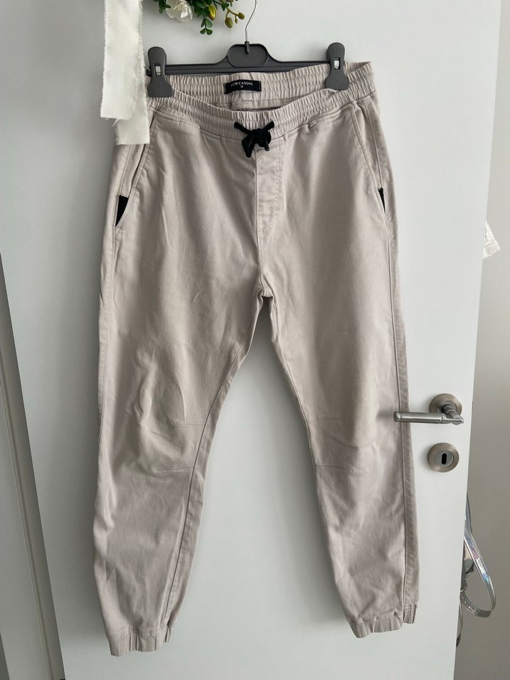 Bej keten kumaştan, kemerli ve normal boy rahat kesim erkek pantolon. Sokak stiline uygun, açık hava kullanımı için ideal. ️