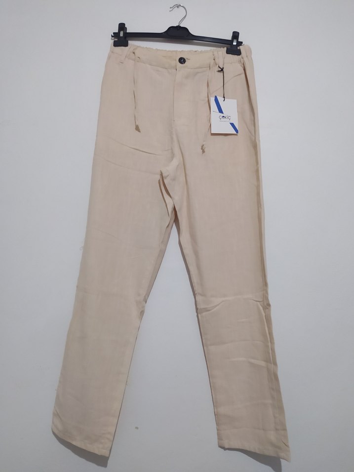 Açık bej renkte, keten kumaştan, rahat kesim erkek pantolon. Düz desensiz, günlük kullanıma uygun, zahmetsiz şıklık sunar. sifir urundur beli lastiklidir bedenleri mevcuttur