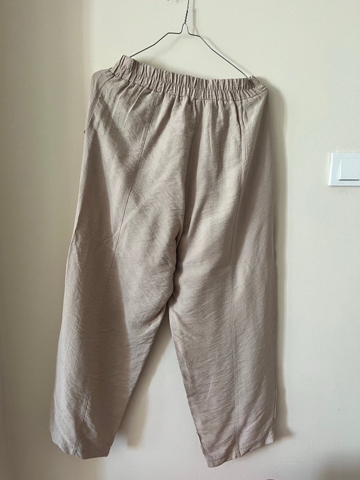 Bej keten kumaştan, rahat kesim ve midi boyda, lastikli bel detaylı kadın pantolon. Minimalist tarzda, günlük kullanıma uygun.