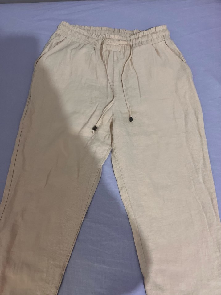 Bej keten kumaştan, lastikli beli ve bağcığı olan rahat kesim midi uzunlukta kadın pantolonu. Günlük sokak stiline uygun, zahmetsiz şıklık sunar.