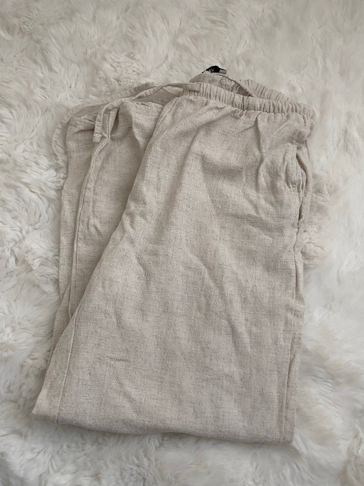 Bej keten kumaştan, rahat kesim ve midi boyda, günlük kullanıma uygun, sade ve bohem tarzda kadın pantolon. Rahat ve zahmetsiz şıklık sunar. Addax sadecw 1 kere giyildi yıkamadan boyunu terziye ayarlattıgım için çekti 150den kısa olanlar için uygun