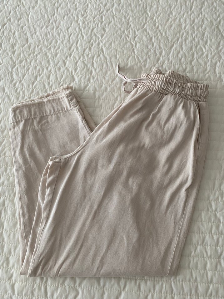 Bej keten kumaştan, rahat kesim ve midi boyda kadın pantolon. Yumuşak ve konforlu dokusu, sade tasarımıyla günlük kullanıma uygundur. Rahat ve şık bir normcore tarz sunar. Sıfır üründür bedeni 42 ama 68.70 kilodaki ge aşşağısı giyebilir