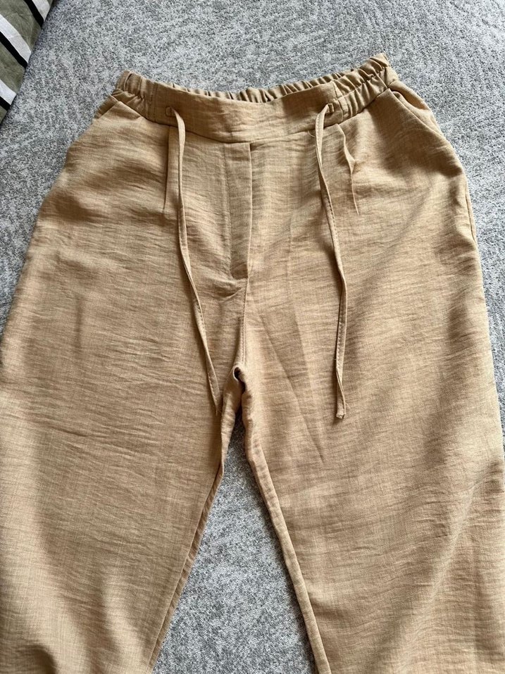 Bej keten kumaştan, rahat kesim midi boy pantolon. Bel kısmında lastik ve bağcık detayları bulunur. Günlük kullanıma uygun, konforlu ve şık bir model.