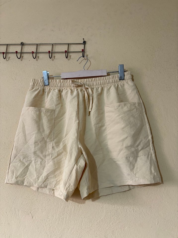 Bej keten kumaştan, rahat kesim ve lastikli bel detaylı mini şort. Düz ve desensiz tasarımıyla günlük sokak stiline uygun.