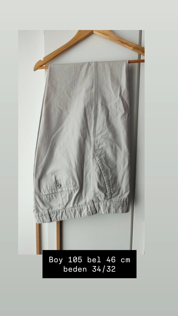 Bej renkte, keten kumaştan yapılmış, regular fit ve desensiz erkek pantolonu. Beden 34/32, boy 105 cm, bel 46 cm.
