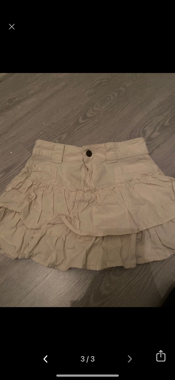 Bej keten midi etek, bol kesim ve fırfır detaylarıyla Paris sokak modasına uygun, rahat ve şık bir görünüme sahiptir. Açık hava kullanımı için idealdir.