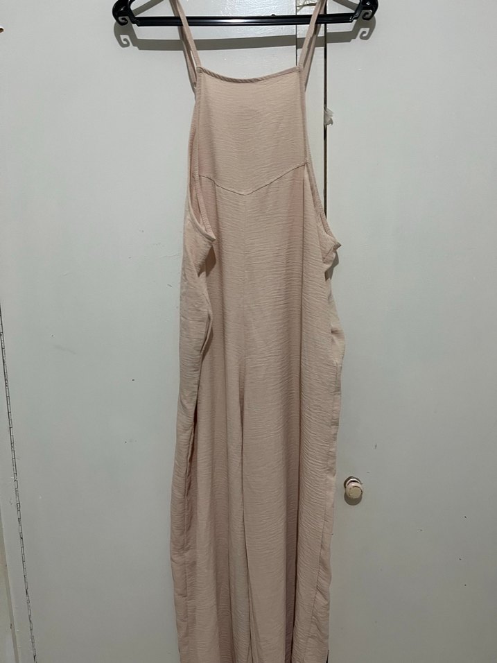 Hamile giyime olur rahat etiketi üstünde Bej keten kumaştan, salaş kesim ve drapeli yan detaylara sahip, yüksek yakalı ve askılı uzun tulum. Minimalist, bohem tarz için uygun.
