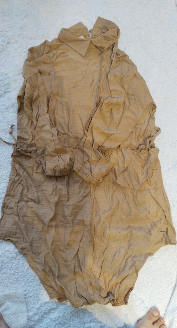Bej keten kumaştan, salaş kesim, yakalı ve uzun kollu tunik, bohem tarzda, rahat bir görünüm sunar.