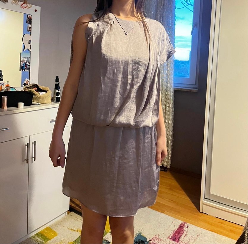Bej keten kumaştan, salaş kesim ve drapeli detaylara sahip, askısız ve kolsuz midi elbise. Günlük rahat kullanım için uygundur.