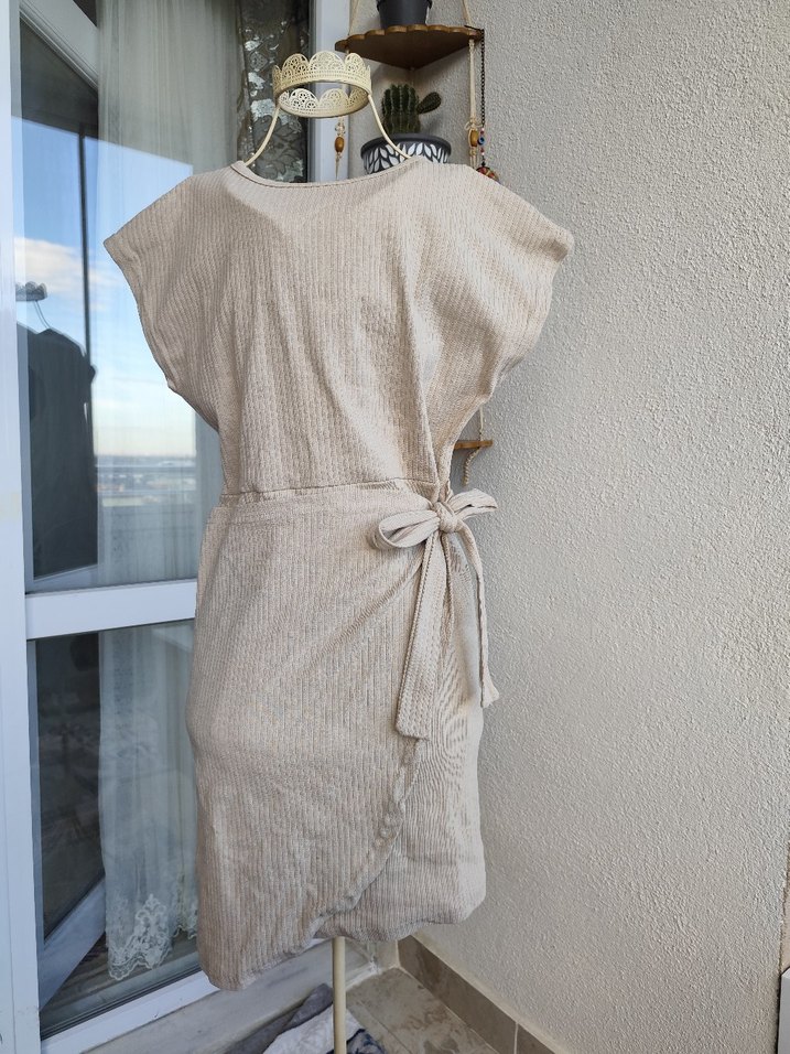 Bej keten midi elbise, salaş kesim ve drapeli tasarıma sahiptir. Askılı, straplez yakaya ve bağlamalı bele sahip bohem tarzı. Günlük kullanım için uygundur.