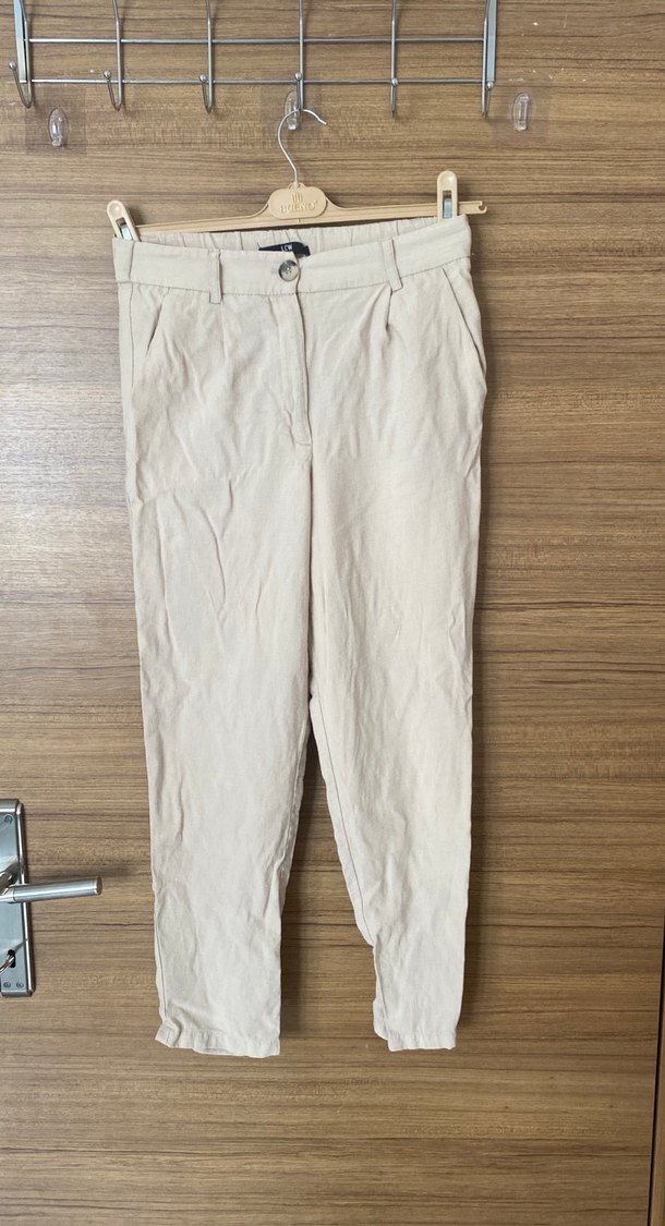 Bej keten kumaştan, salaş kesim ve midi boy kadın pantolon. Günlük ve rahat sokak tarzı için kolay şıklık sunar.
