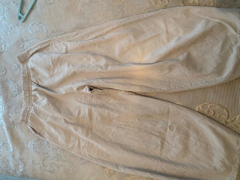 Bej keten kumaştan, salaş kesim ve drapeli detaylara sahip midi boy kadın pantolon. Minimalist ve normcore tarzda, günlük kullanıma uygun.