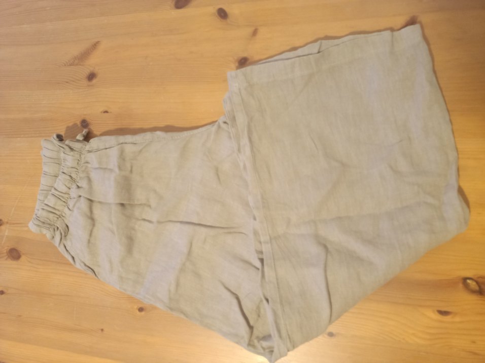 Salaş kesim, keten kumaştan yapılmış bej renkli, drapeli midi uzunlukta rahat bohem tarzı kadın pantolonu.