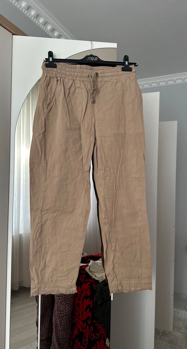 Bej keten kumaştan, elastik bel ve bağcık detaylı, salaş kesim midi pantolon. Günlük kullanıma uygun, rahat ve şık.