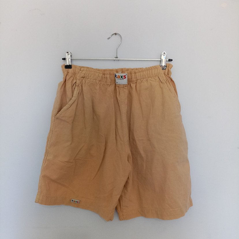 Bej keten, salaş kesim ve mini boy hamile şortu, rahatlık için lastikli bel detayına sahip. Günlük kullanım için minimalist sokak stilinde.