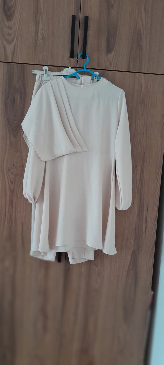 Uzun kollu, yuvarlak yakalı bej takim salaş kesim ve drapeli detaylara sahip. Kısa boyu ve minimalist tarzıyla günlük kullanıma uygun.