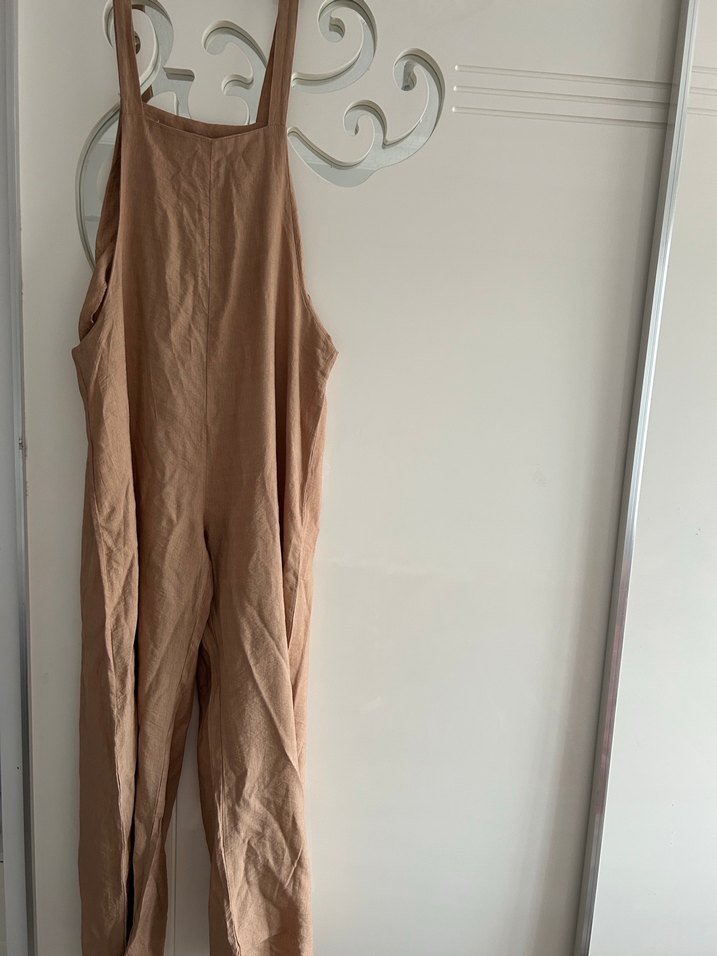 tüm ölçüler mevcut. hiç bir kusuru yok. dar bıl geldi kısa uzun geldi diye iade kabul etmem. Drapeli, askısız bej keten tulum. Salaş kesim ve midi boyda, günlük kullanıma uygun minimal tarzda.
